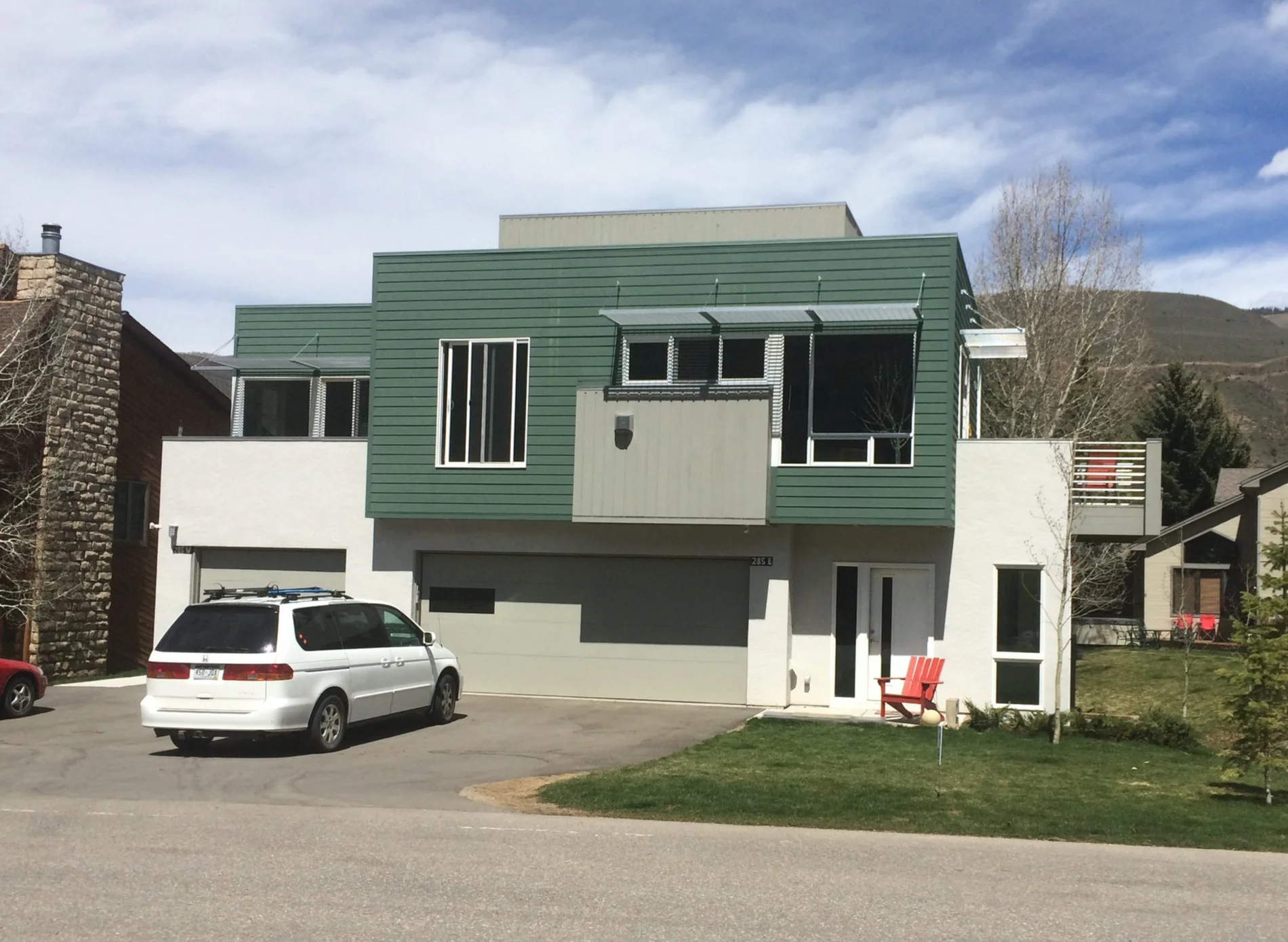 While not immediately obvious to people at 10,000 ft elevation level flat roofs have a long history in Main street development of established mining towns. In addition the benefits of providing space for solar collectors and eliminating the possibility of falling ice and snow and ice-damming won the approval of Dr.Schamberger..